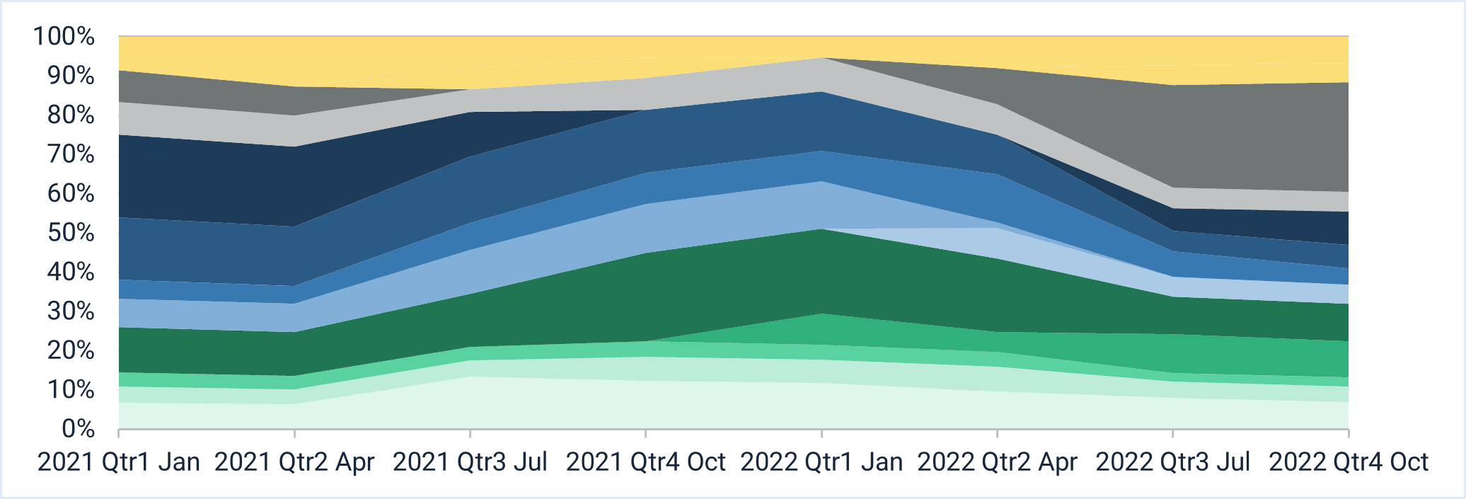 The below chart shows the allocation of different types of fixed income bonds that we held. It starts in 2021 and finishes in the fourth quarter of 2022. You can see how active we were in managing our fixed income exposures away from government bonds (dark grey) and investment grade corporate bonds (dark blue), favouring alternative fixed income (green).