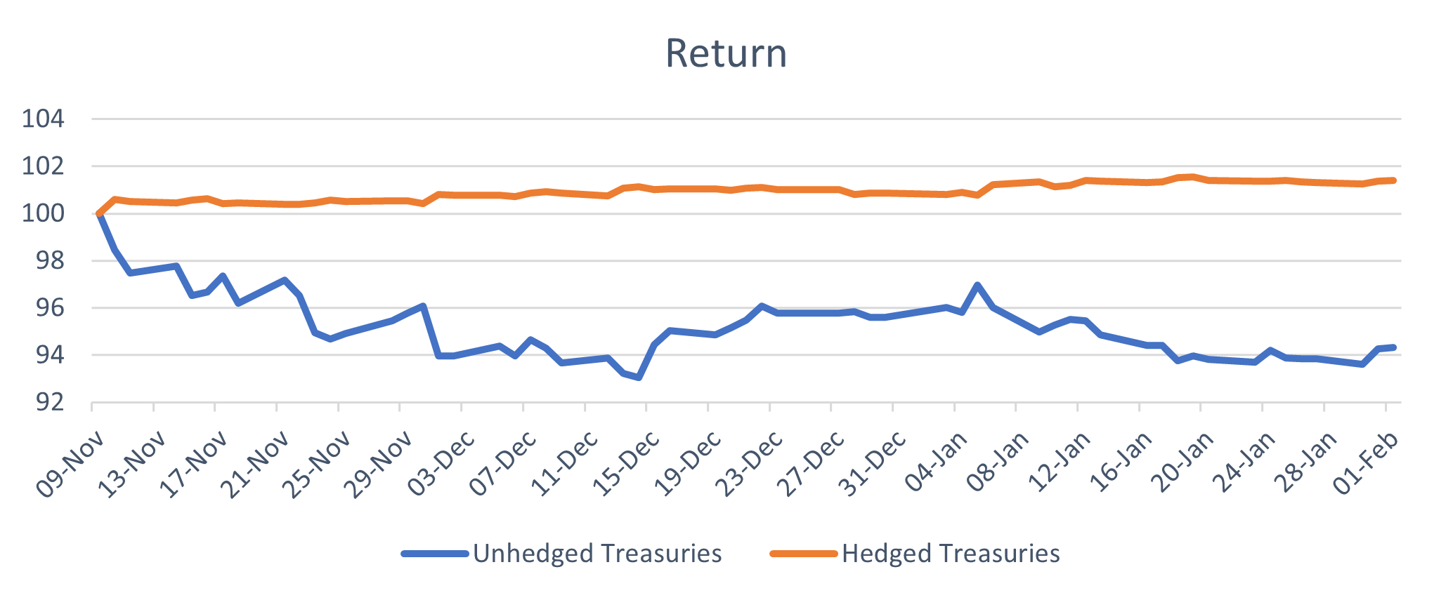 In November, we decided we no longer wanted such high exposure to the US dollar on our US treasuries. The US dollar had risen so strongly in the year already that we felt further upside in the dollar was likely to be minimal. There was also potential for some serious losses if the US dollar reduced in value, which is what happened. The chart below shows the return on our US treasuries once we decided to hedge the currency risk. The orange line shows the return our investors received (positive returns because we hedged the currency risk) versus the blue line, which shows what would have happened had we not hedged the currency risk in November. Whilst Saltus are certainly not currency traders or speculators, we are aware of currency risk as it impacts returns and we will take a view on the currency when our conviction is high enough.