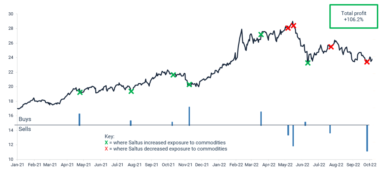 As part of our exposure to alternatives, throughout 2021 we built a position in commodities, which we saw as an effective way to increase inflation protection within portfolios. You can see how effective this was by looking at the below chart. The black line shows the price of the instrument we used. The green crosses indicate where we increased exposure to the instrument, the red crosses show where we reduced exposure. The bars under the crosses indicate the size of the trades we made.
