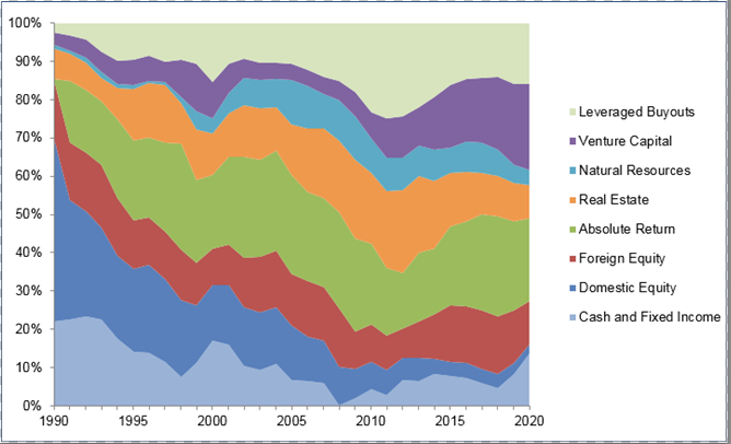 Under the tutelage of David Swenson and Dean Takahashi, the Yale ‘Endowment Model’ of investing, took advantage of the universities long term time horizons, to embrace complexity and illiquidity by investing in private assets and various hedged strategies, alongside more traditional stocks and bonds.