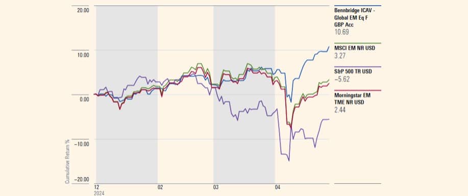 The fund has performed remarkably well given the recent volatility, as can be seen in the above graph. Please note that the Skerryvore fund appears as Bennbridge on the chart due to data feeds not yet reflecting a recent acquisition. Year to date the fund has posted +10.7% return which is significantly higher than the MSCI Emerging Markets index which has returned +3.4%. The return is even more impressive when looking at the broader equity market where the S&P has posted a -5.8% return on the year to April 28th.