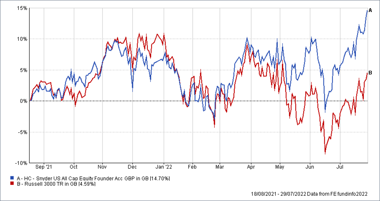Source FE Analytics. Performance to 31 July 2022, after fees. Benchmark is Russell 3000 total return. Inception date of position 15 Aug 2021.