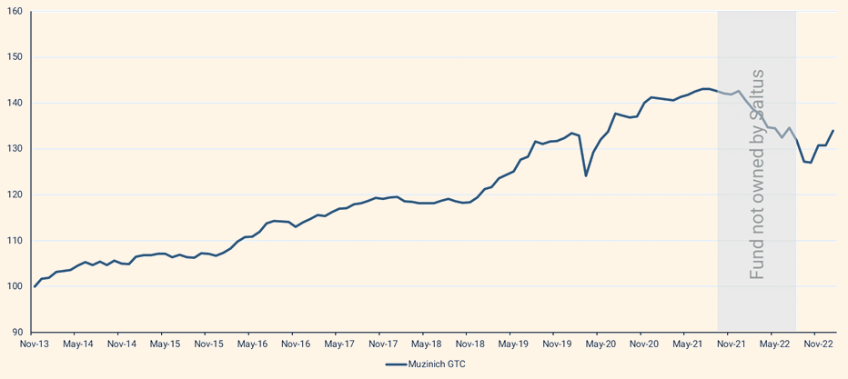 Saltus first invested in this fund in 2013, and because we were one of its earliest investors, we secured a lifetime discount. The Saltus investment team decided to sell it in 2021 because in their view, the yields on offer didn’t compensate our investors for the risk it posed. The fund then struggled throughout 2022 and, when the yield on offer increased to about 6%, we re-invested. The fund still yields around 6% and is a good example of how the opportunity set has changed, yields on many bonds are attractive again in our view.