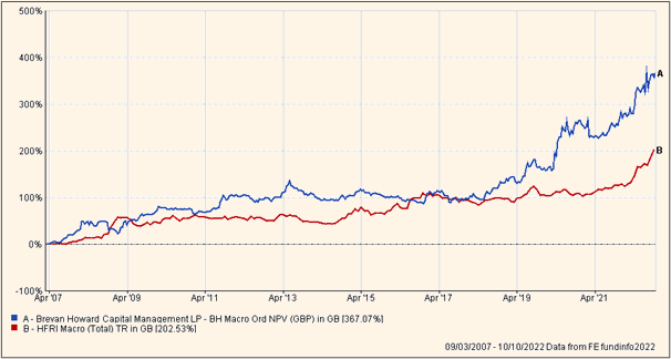 Source: FE Analytics. Performance to 30 September 2022, after fees. Returns longer than 1 year have been annualised. Benchmark is Hedge Fund Research Performance Index, a global, equal-weighted index of single-manager hedge funds.