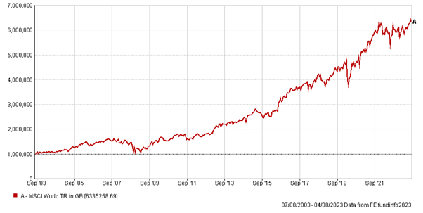 Take, for instance, £1 million invested in global stocks over 20 years, as shown in the chart below: