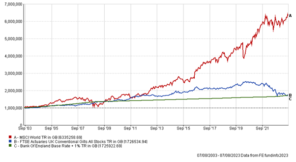 The above chart shows the journey of £1 million invested into global stocks in red (MSCI World), bonds in blue (UK government bonds), and cash in green (using the Bank of England base rate + 1% as a proxy for cash). The differences after 20 years are startling: