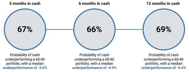 Using a portfolio to outperform the return on cash involves taking risk. Over short time periods, it’s less likely that a portfolio will beat the return on cash, but it’s still favourable. Using data from 1990 to 2023, Vanguard looked at the returns of cash versus a standard 60:40 portfolio (60% stocks and 40% bonds). Their analysis shows that, over 6-month time frames, there is a 66% chance that a 60:40 portfolio beats cash. Over 12 months, there is a 69% chance.