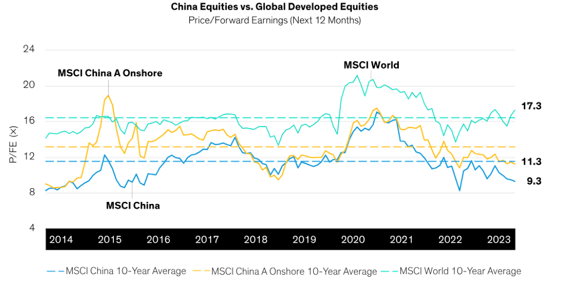 Looking ahead, there may be some potential for Chinese equities. The current valuations of Chinese equities appear to be cheap when compared to the last decade, and in relation to the MSCI World Index, which represents stocks in developed markets.