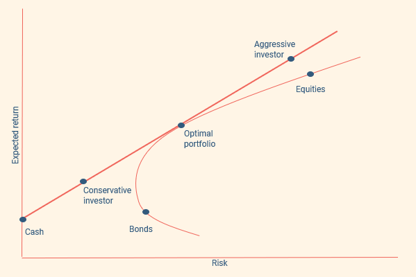 MPT attempts to provide a solution to an investor that is only focused on maximum return with no access to capital needed, by introducing the Two Mutual Fund Theorem (in this case the two mutual funds can be seen as multi-asset portfolios). This theorem states that any portfolio on the efficient frontier can be generated by holding a combination of any two given portfolios that are already on the frontier. If the location of the portfolio on the frontier is in between the two funds, (the conservative investor below) then both will be held in positive quantities (50% cash, 50% the optimal portfolio). If instead, the portfolio is outside of these two (the aggressive investor), then the lower risk fund would have to be held in a negative quantity (-50% cash, 150% in the optimal portfolio). Obviously, in the real world, shorting is not an option for many investors, so the aim instead would be to find the portfolio that sits on the efficient frontier when no cash is held at all.