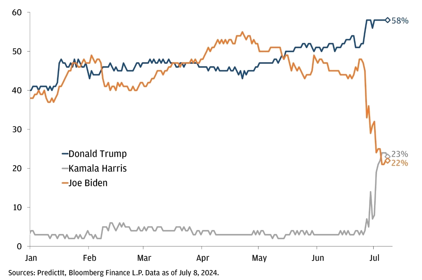 Although White House officials have not suggested that Biden will drop out, betting markets are now favouring Kamala Harris over Biden for the election. These betting markets are more retail-oriented and do not reflect larger institutional capital but are still interesting as an indicator of public sentiment.