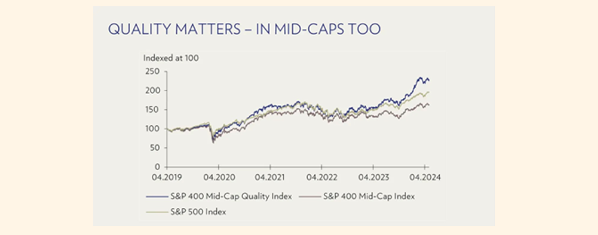 The current stock market rally has been led by large/mega-cap stocks, but since the beginning of the year, it has become much more balanced. With the US economy showing strength and positive signs from Europe and China, mid-cap stocks, which tend to be more sensitive to economic cycles, are now joining the rally and have potential to catch up. At Saltus, we prefer high-quality mid-cap stocks, many of which can be represented by the S&P 500 with an equal weighting to the index. Throughout 2024 we have added to this market through our various US and global funds, allowing us to capture much of the upside. The S&P 500 is up around 15% on the year as of the end of June 2024. The chart below simply shows the outperformance of mid-cap quality companies when compared to the S&P 500. [1]