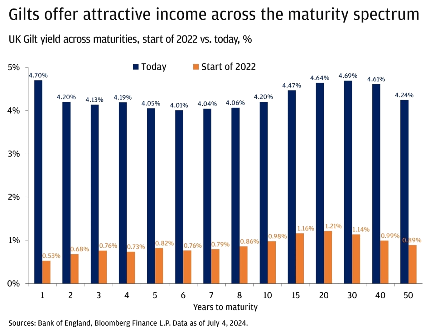 Therefore, today’s high cash rates above 5% probably won’t last long. Markets have, however, seemed to underestimate the likelihood of Bank of England cuts starting in July, creating an opportunity to lock in longer-term yields in UK fixed income markets, particularly at the front end, which is more sensitive to central bank policy rates.