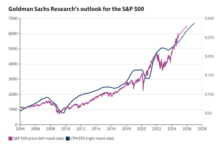 Goldman Sachs anticipates S&P 500 earnings per share (EPS) to reach $265 in 2025 and $288 in 2026, in line with the median market consensus. These estimates, however, are slightly lower than the more optimistic bottom-up forecasts based on individual company estimates, which suggest EPS of $275 for 2025 and $311 for 2026. This represents EPS growth over 2025 of some 11%.
