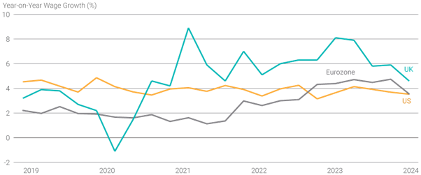 Another area of concern is wage inflation, which remains more pronounced in the UK compared to the US and the rest of Europe.[8] The chart below illustrates the year-on-year difference in wage growth across the UK, EU and US. Public sector wage increases above the rate of inflation are a major factor, keeping wage inflation elevated and contributing to broader price pressures.