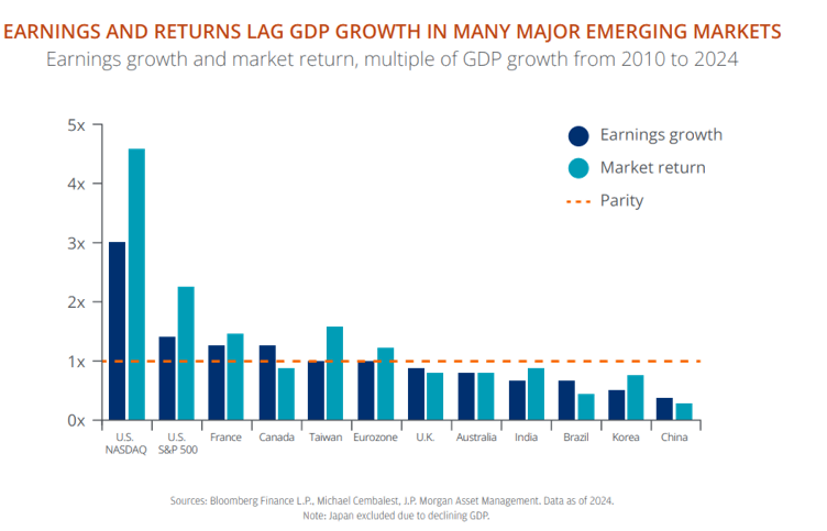 - Even when EM economies achieve robust GDP growth, this doesn’t always translate into earnings per share or market returns. Shareholder dilution, volatile earnings, and fluctuating currency values can disrupt compounding, limiting long term performance.