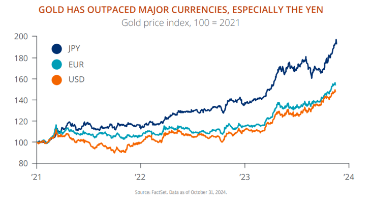 As we look to the year ahead, gold’s upward trajectory appears supported by strong fundamentals. Whether as a hedge against market volatility, a defence against geopolitical uncertainty, or a tool for currency diversification, gold is well-positioned to remain a valuable asset in any portfolio. We maintain our exposure to gold and gold miners in our portfolios heading into 2025.