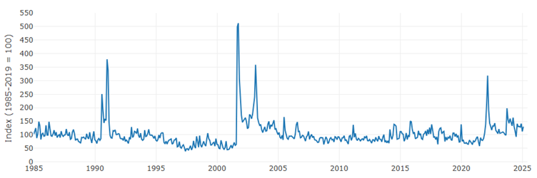 Recent sharp increases in the GPR were largely driven by the Russian invasion of Ukraine in 2022 and Chinese military manoeuvres near Taiwan in 2023.[5] At present, however, the GPR remains only slightly above its long term average, suggesting that while risks are elevated, they are not yet at extreme levels as seen in 2001 for example.