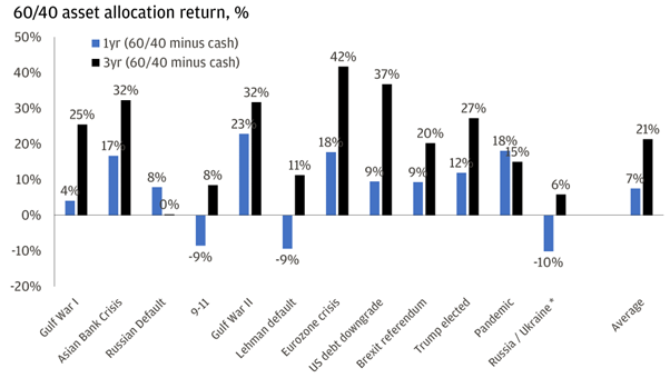 Some investors might believe that holding cash is a “safe haven” asset during periods of geopolitical tension. Below is a chart showing market crashes since 1990 to compare how cash has performed versus a typical balanced allocation. (Cash is defined as return of 3-Month T-Bill. Balanced allocation being 60% MSCI World Index & 40% Bloomberg Global Aggregate Index).